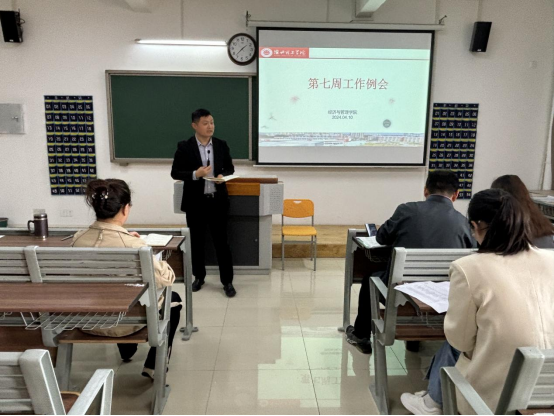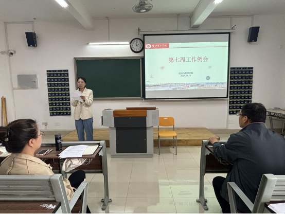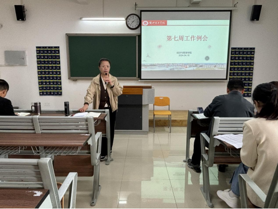 2024年4月10日下午,bat365在线中国官网登录入口在一教213召开bat365在线中国官网登录入口第七周工作例会,院长吴玲主持会议,副院长秦品德、院长助理张珊以及全体教师参会。