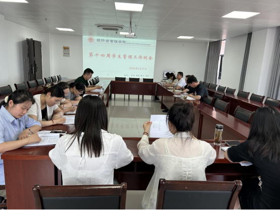 2024年5月27日,bat365在线中国官网登录入口在行政楼725会议室召开本学期第十四周学生管理工作例会,副院长秦品德、院长助理张珊、书记助理叶赵强以及全体辅导员参加会议,会议由院长吴玲主持。
