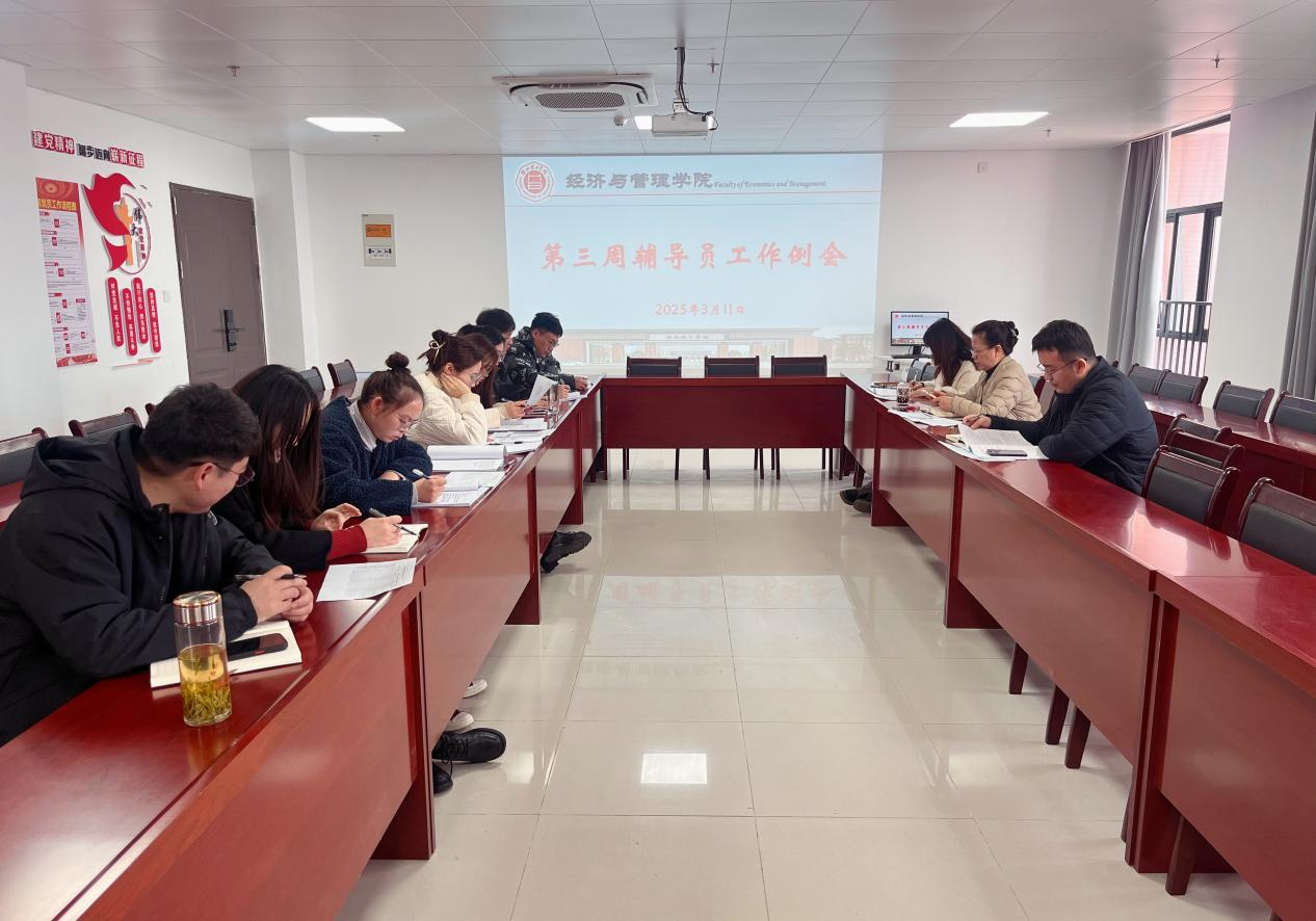 2025年3月11日,bat365在线中国官网登录入口在行政楼725会议室召开了本学期开学第三周的学生管理工作例会。学院书记助理员禹辛、团总支书记王绎程及全体辅导员参会,会议由院长吴玲主持。
