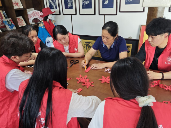 在实践活动的第二站,团队走访了徽州剪纸非遗传承人吴笑梅老师。吴老师向实践团成员们介绍了徽州剪纸的历史渊源及其独特的艺术风格,并现场展示了剪纸的基本技法。在吴老师的指导下,成员们亲自动手体验剪纸创作,感受到这一传统技艺的精妙与魅力。大家的剪纸作品栩栩如生,生动展现了徽州剪纸的艺术之美。