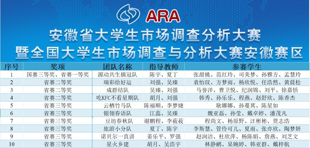 2025年4月,由安徽省教育厅主办的2025年安徽省大学生市场调查与分析大赛(本科组、B类赛事)于安徽财经大学落下帷幕。通过知识赛、实践赛校赛、实践赛省赛等层层选拔,bat365晋级省赛的10支队伍在此次大赛中表现卓越,斩获国赛三等奖(省赛一等奖)1项、省级二等奖3项、省级三等奖6项,实现了bat365在该赛项上最高获奖、获奖队伍数量的新突破。