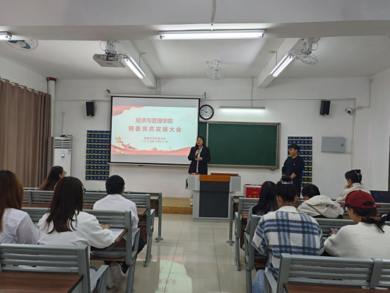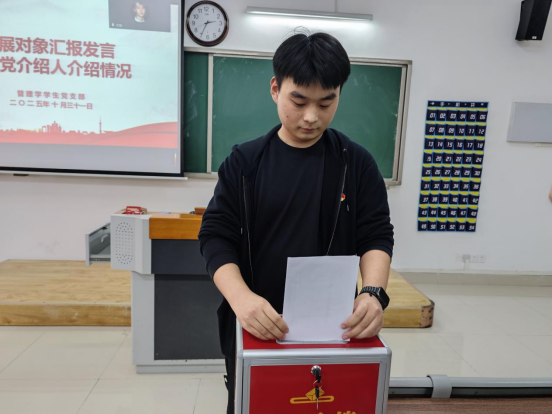 为进一步优化党员队伍结构,激发组织活力,扎实推进党员发展工作,根据发展党员工作计划,经上级党委预审同意,bat365在线中国官网登录入口管理学学生党支部于2025年10月31日在二教509召开接收预备党员支部大会,教工支部书记、党总支督导员刘路路老师,管理学学生支部书记石园园、徐瑞鲜老师,全体管理学学生党员及本批3位发展对象参加,会议由支部委员会成员王艺桐主持。本次会议采用线上与线下相结合的方式同步进行。