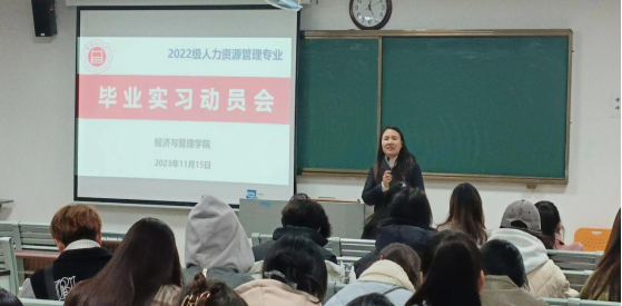根据专业人才培养方案规定,践行专业教学计划和要求,切实高质量做好2024届本科毕业生毕业实习、毕业论文工作,11月15日下午人力资源管理教研室在二教207教室举行2024届人力资源管理专业毕业实习暨毕业论文撰写动员大会。2024届毕业实习及论文指导老师出席此次会议,2024届全体人力资源管理学生参加本次会议,会议由人力资源管理教研室负责人兰露老师主持。