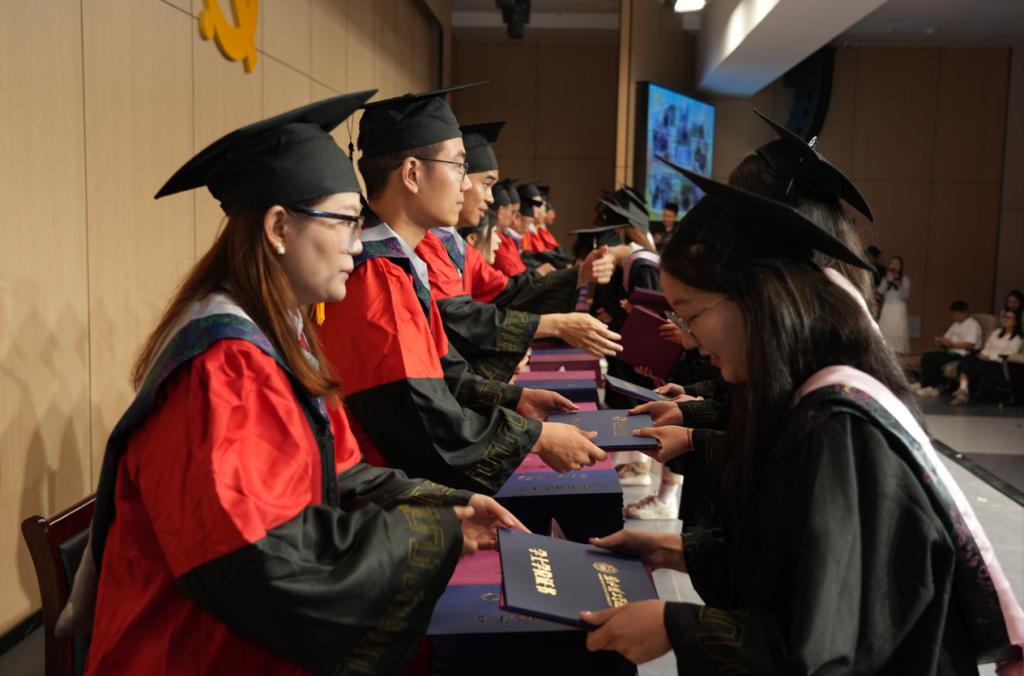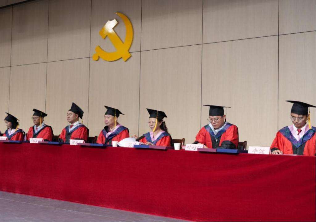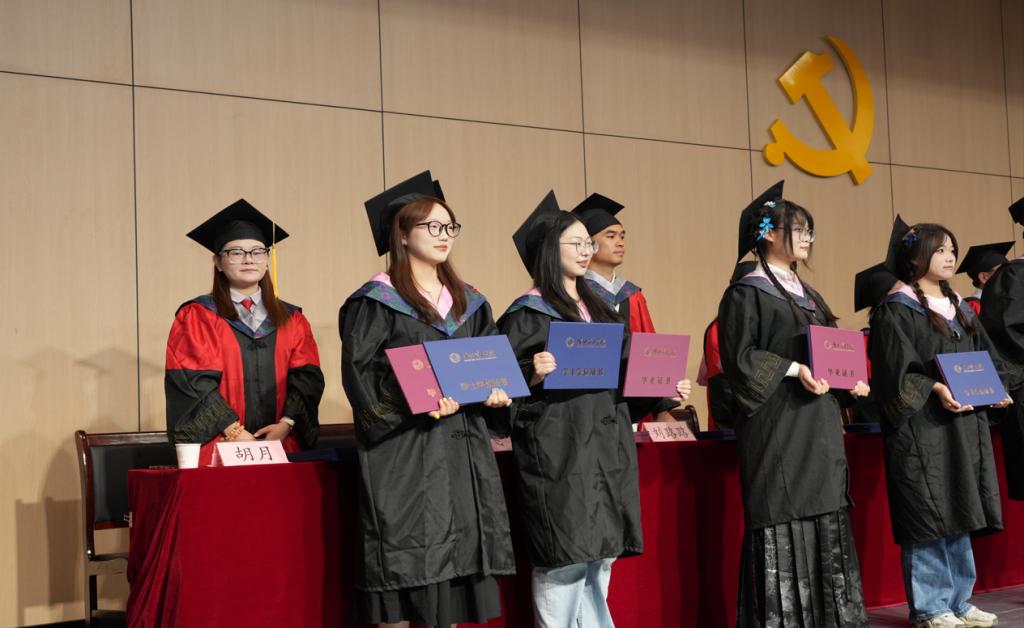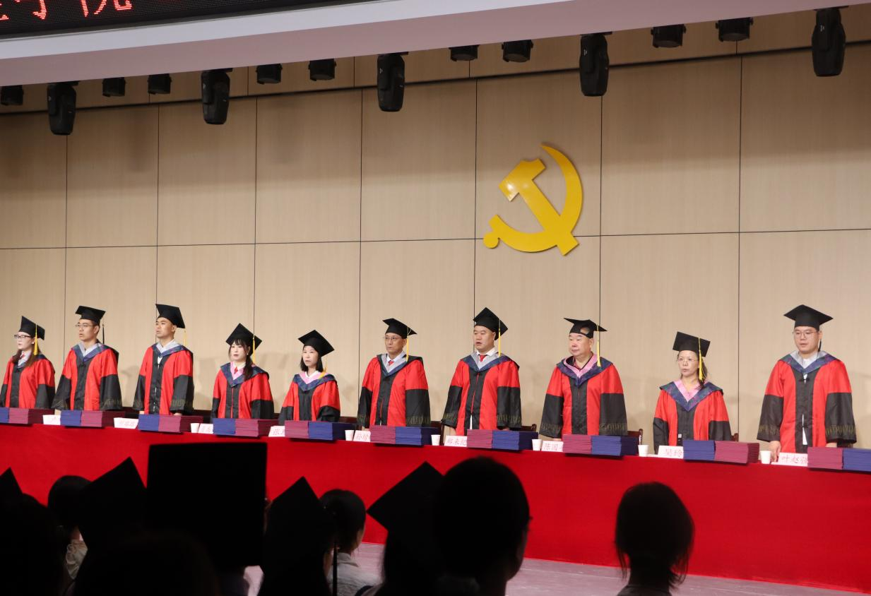 在学位授予环节,校院两级领导为毕业生逐一拨穗正冠、颁发证书。现场掌声不断,不少毕业生激动地与导师握手、拥抱,场面温馨感人。
