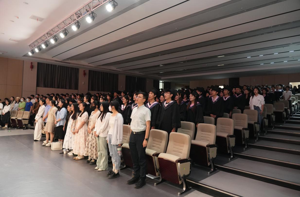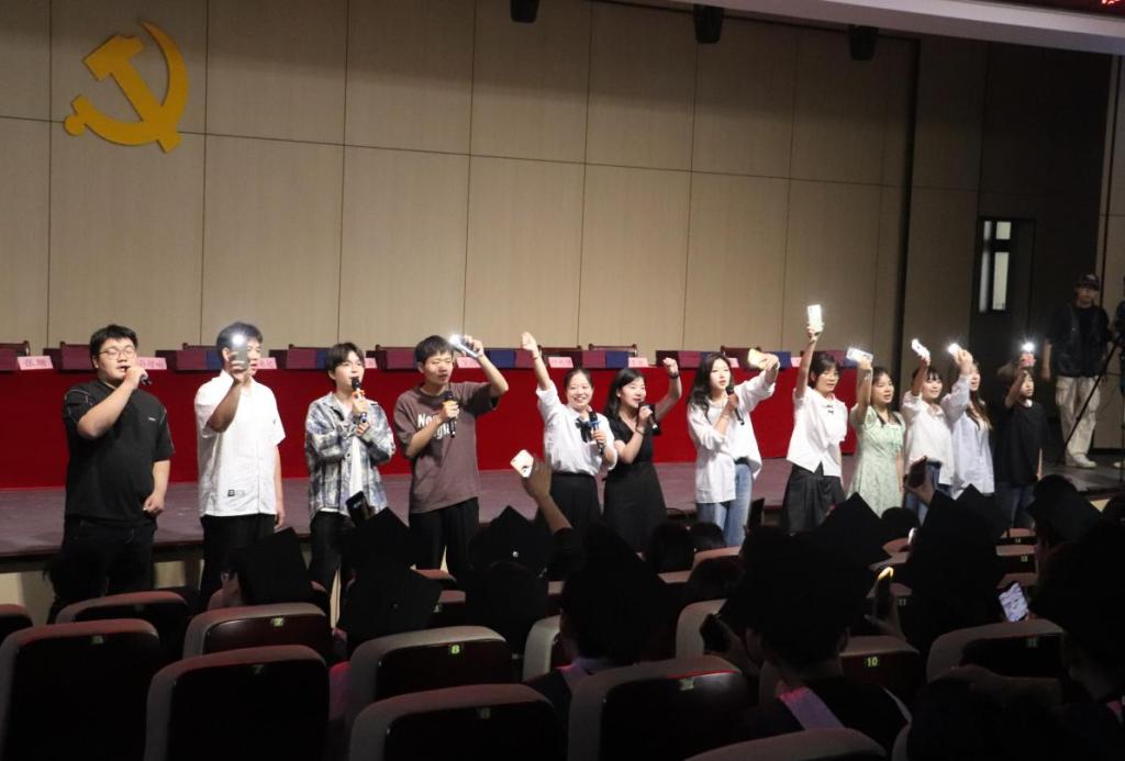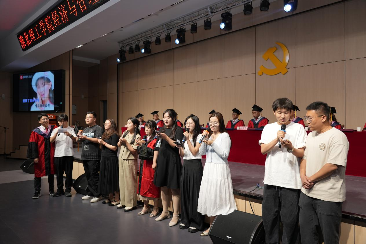 典礼开始前,现场播放了学院精心制作的毕业纪念视频。视频以“成长·感恩·启航”为主线,全景式展现了2025届学子四年来在校园里的求学点滴。随后,由12名学生代表深情献唱《北京东路的日子》、《晴天》、《时间煮雨》、《我们的明天》等青春组曲,用歌声为学长学姐传递美好祝愿,也为典礼增添了浓浓的校友情。