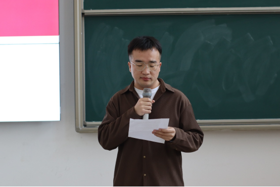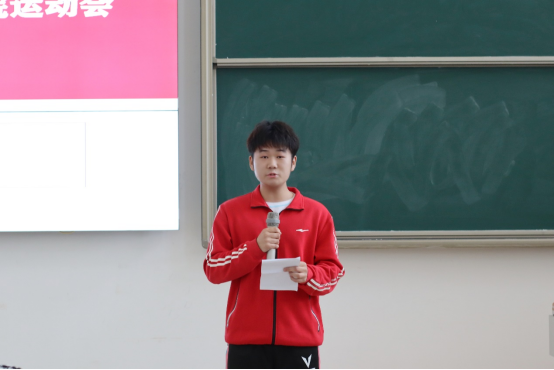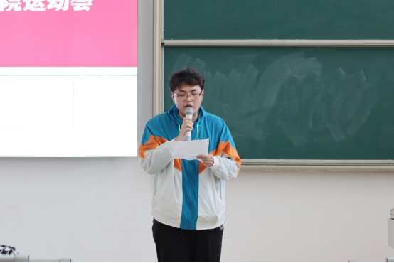 会议第三项,学生会志愿者代表文体部部长周宗耀发言,他表示运动会是一项综合性教学活动,校运会要想组织开展好,需要各方的努力和配合,希望经管学院全体学生运动员严格遵守大学生日常行为规范和运动员守则,服从大会安排,尊重裁判及对手,发扬顽强拼搏的精神,赛出风格、赛出水平。希望运动员们发扬更高,更快,更强的体育精神,放松心态,全力以赴,为学院争光添彩。