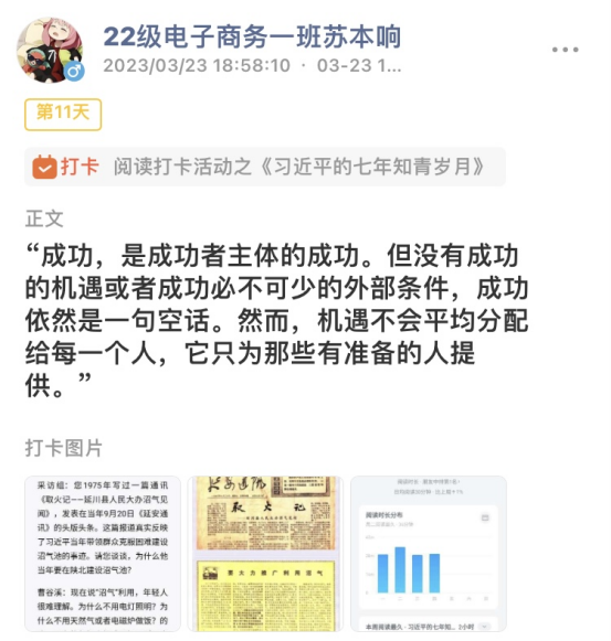 活动期间,读书打卡采取积分制,凡参加同学按时完成打卡,将读书笔记分享至线上平台。同学们通过微信读书app连续十二天阅读《习近平的七年知青岁月》,在阅读学习的过程中,许多同学都感受到了一种“相见恨晚”、“废寝忘食”的阅读体验,大家踊跃交流学习的心得体会,形成了“学习领袖青春故事、争做知行合一青年”的浓厚氛围。通过学习领袖的青春故事,同学们无不为其中所蕴含的视野、胸怀和境界所感动,大家积极表示要牢记总书记对广大青年所发出的“扣好人生第一粒扣子”要求,争做一名志存高远、脚踏实地、知行合一的青年。2022级电子商务一班苏本响同学就表示在阅读《习近平的七年知青岁月》过程中,对青春有了新的理解,人的一生只有一次青春,现在,青春是用来奋斗的;将来,青春是用来回忆的。只有进行了激情奋斗的青春,只有进行了顽强拼搏的青春,才会留下充实、温暖、持久、无悔的青春回忆。