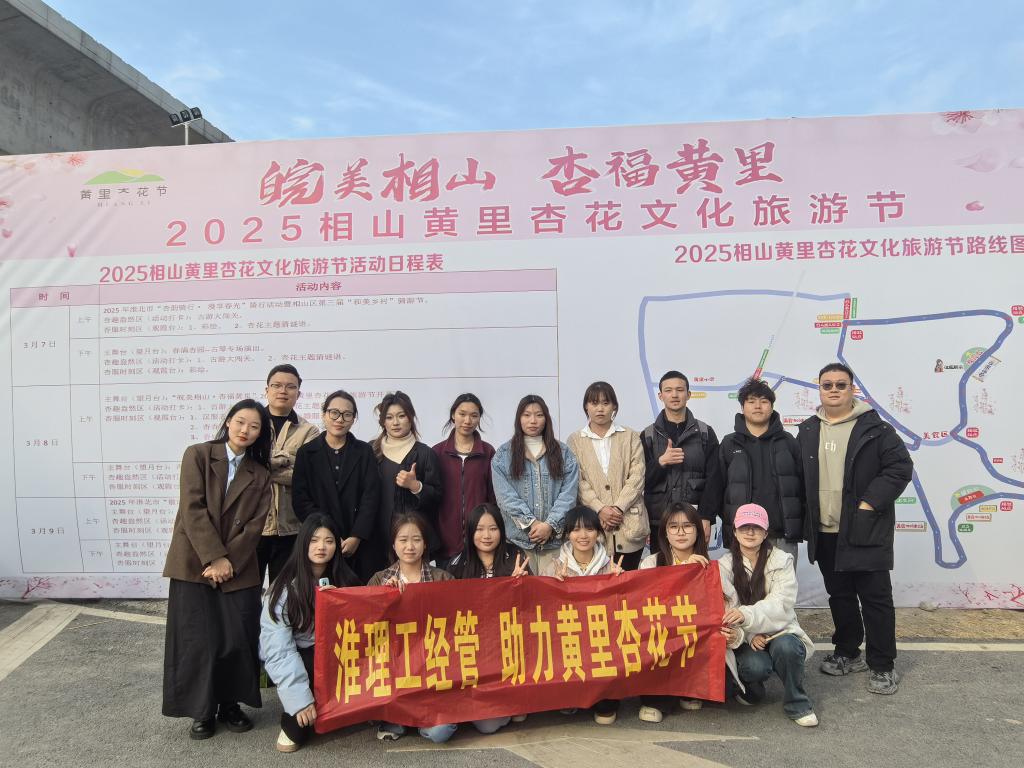2025年3月8日至9日,淮北理工学院经管学院23级电子商务专业的14名学子应淮北市相山区文化旅游体育局邀请,赴黄里杏花节开展“青春直播助力行”主题实践活动, 以青春之声赋能文旅宣传。学生们以“宣传大使”身份通过实时直播推广杏花节,累计完成超20场次浸式文旅推介,达成超5万人次线上曝光,为地方文旅经济注入青春动能。