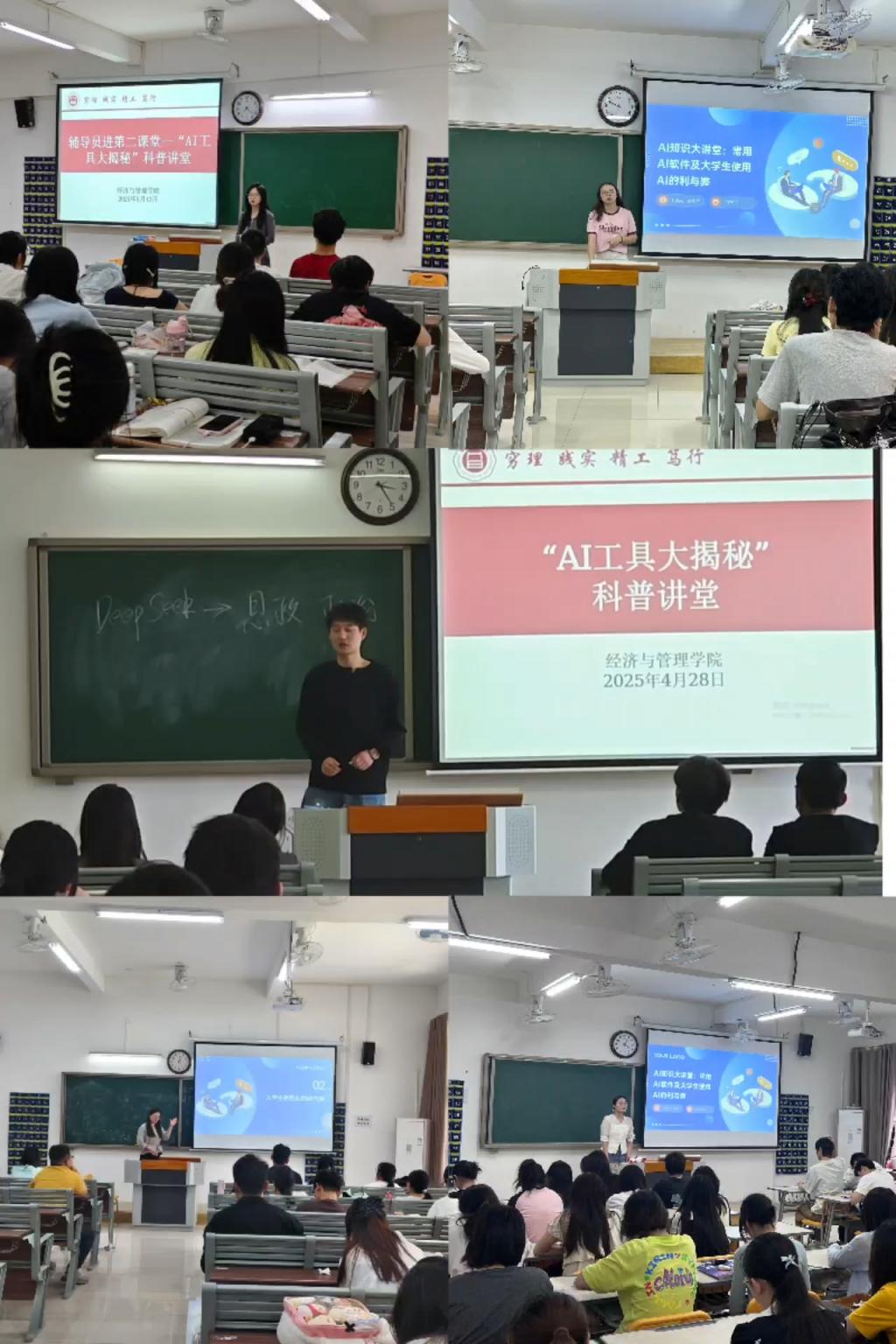 全体辅导员二进第二课堂科普赋能·强基础。针对前期调研发现的知识短板问题,辅导员精心设计“AI工具大揭秘”科普讲堂,深入走进各班级,通过“理论+实操+互动”三位一体的教学模式,有效提升学生的AI认知水平和应用能力。