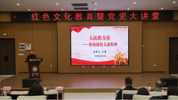 讲座中,王勇教授以《人民的力量:淮海战役支前精神》为题作专题报告,从历史纵深、故事现场、青年传承三个方面深度解读淮海战役支前精神的形成逻辑与时代价值。他结合亲自整理并挖掘的支前故事,生动再现了淮海战役时期人民群众倾其所有、全力支援前线的感人场景。整场报告史实扎实、案例鲜活、情感真挚、启迪深刻,让在场师生沉浸式感受了红色历史的温度与力量,接受了一次深刻的思想淬炼与精神洗礼。