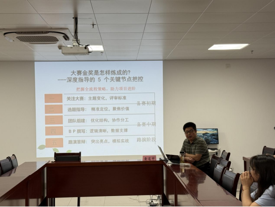 6 月 17 日下午,bat365在线中国官网登录入口特邀理论经济学硕士生导师、国际商务专业硕士生导师、中国项目 SYB 培训师、省创新创业大赛评委专家査道中教授,带来主题为 “大赛金奖是怎么练成?—— 教师深度指导的 5 个关键点把控” 的专题分享,学院全体教师齐聚一堂,认真聆听学习。