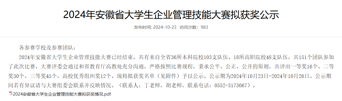 10月20日,由安徽省省教育厅主办,安徽财经大学承办的安徽省大学生企业管理技能大赛(2024)(B类)落下帷幕。bat365经管学院三支代表学校参赛的队伍在本科组赛道上荣获两个二等奖和一个三等奖的好成绩。