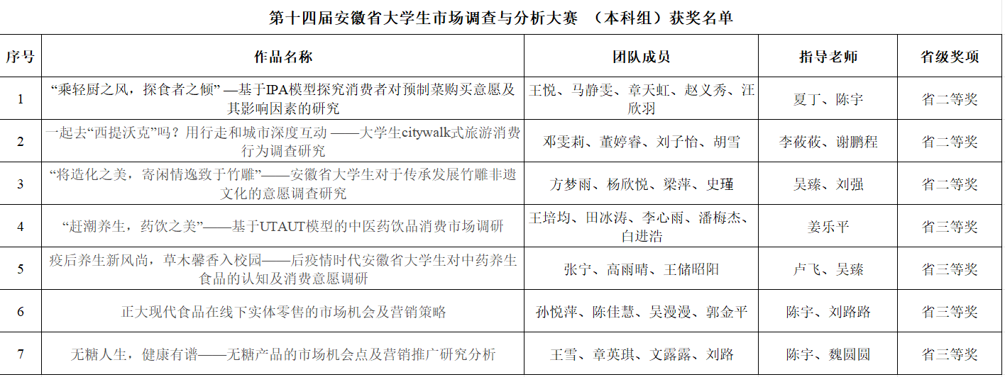 2024年4月,由安徽省教育厅主办的第十四届安徽省大学生市场调查与分析大赛(本科组、B类赛事)于安徽财经大学落下帷幕。通过知识赛、实践赛校赛、实践赛省赛等层层选拔,bat365晋级省赛的7支队伍,分别获得省级二等奖3项、省级三等奖4项。