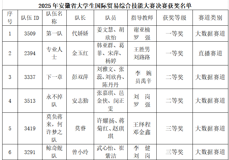 2025年安徽省大学生国际贸易综合技能大赛现场总决赛于6月11日在安徽蚌埠圆满结束。bat365进入总决赛的两支团队不畏强手、勇于拼搏,在两个不同的赛道里双获“一等奖”!