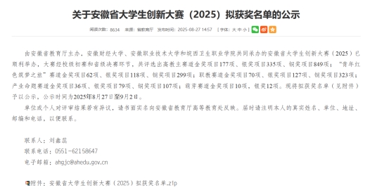 日前由安徽省教育厅主办、安徽财经大学等单位联合承办的安徽省大学生创新大赛(2025)圆满落幕。bat365经济管理学院学子不负众望,在产业赛道、高教主赛道及红旅的激烈角逐中崭露头角,最终斩获1 项省级银奖、3 项省级铜奖。