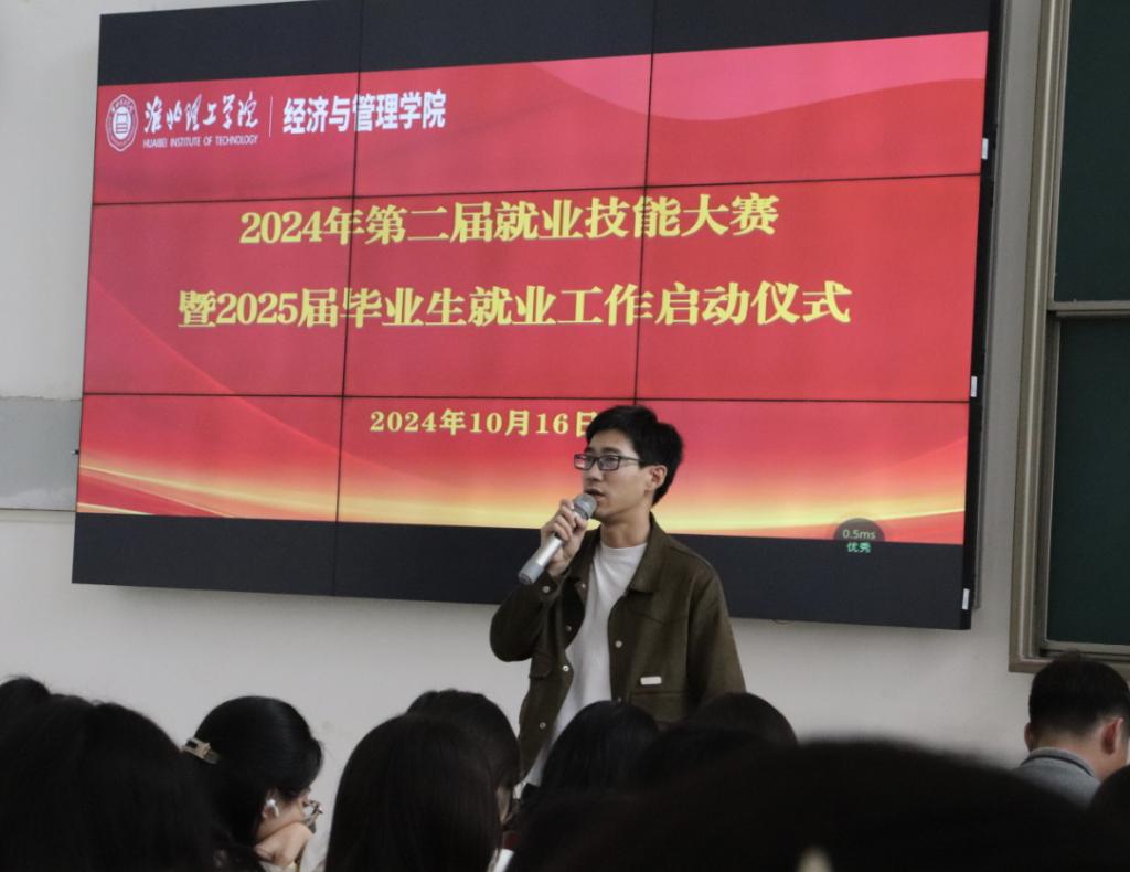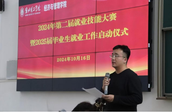 2025届毕业班辅导员代表刘子恢在大会上对2025届毕业生进行主题讲话,就目前竞争激烈的大环境,要求同学们努力提升自己的专业知识和沟通能力,加强校企合作,要实现先就业再择业的目标。