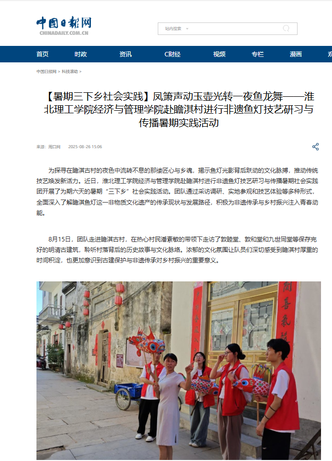 为探寻在瞻淇古村的夜色中流转不息的那缕匠心与乡魂,揭示鱼灯光影背后跃动的文化脉搏,推动传统技艺焕发新活力。近日,淮北理工学院bat365在线中国官网登录入口赴瞻淇村进行非遗鱼灯技艺研习与传播暑期社会实践团开展了为期六天的暑期“三下乡”社会实践活动。团队通过采访调研、实地参观和技艺体验等多种形式,全面深入了解瞻淇鱼灯这一非物质文化遗产的传承现状与发展路径,积极为非遗传承与乡村振兴注入青春动能。对此,中国日报网进行了报道: