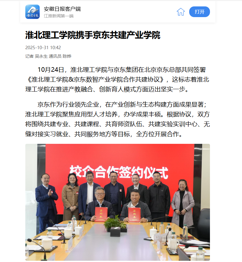 10月24日,淮北理工学院与京东集团在北京京东总部共同签署《淮北理工学院&京东数智产业学院合作共建协议》,这标志着淮北理工学院在推进产教融合、创新育人模式方面迈出坚实一步。对此,安徽日报进行了报道: